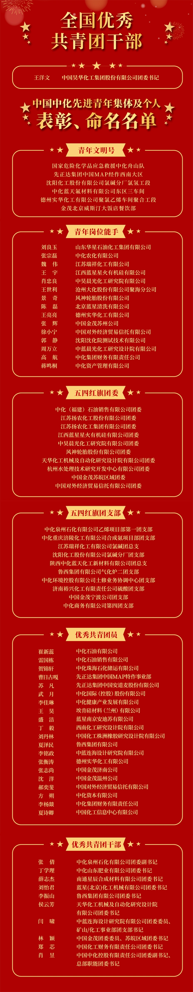 在五四青年节到来之际,为庆祝中国共产主义青年团成立100周年,充分发挥青年先进典型示范作用,激励公司各级团组织和广大青年建功立业、成长成才,经层层推荐选拔,中国中化命名青年文明号6个,评选出青年岗位能手15人、五四红旗团委10个、五四红旗团支部10个、优秀共青团干部10人、优秀共青团员20人。公司1名团干部获全国优秀共青团干部称号。 这些获表彰的先进青年和集体在生产经营主战场、科技创新最前沿、重点项目第一线、国际化经营大舞台、基层实践大熔炉中贡献才智、实干苦干、冲锋在前,充分发挥了青年生力军和突击队作用,以青春建功献礼党的二十大,以昂扬姿态奋进伟大新征程。