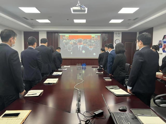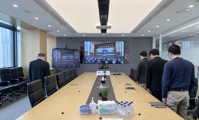 12月6日上午10 时,党中央、全国人大常委会、国务院、全国政协、中央军委在北京人民大会堂隆重举行江泽民同志追悼大会。中共中央总书记、国家主席、中央军委主席习近平在追悼大会上致悼词。 江泽民同志治丧委员会委员,中国中化党组书记、董事长李凡荣在人民大会堂参加追悼大会;中国中化党组成员、副总经理、总会计师李福利,党组成员、纪检监察组组长王舸,党组成员、副总经理阳世昊,党组成员、副总经理张方在公司总部集中收看江泽民同志追悼大会实况;公司各级干部职工通过多种方式收听收看追悼大会,沉痛悼念江泽民同志。