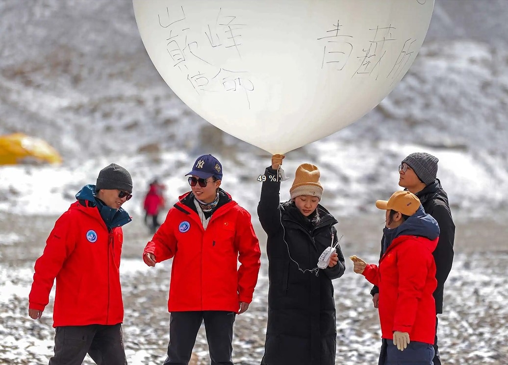Scientific research members launch a balloon carrying radiosonde at the Mount Qomolangma base camp. Photo by Xinhua/Jiang Fan
